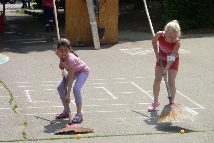 Auf dem Schulhof der Grundschule wurde dieses Jahr ein etwas anderes Programm geboten. Dort sind die verschiedensten Spiele aufgebaut worden - alle natürlich immer mit einem zu der Feuerwehr verbundenen Hintergrund. Mit Geräten, die eigentlich der Brandbekämpfung dienen sollen, die Jugendwart Erek den Drittklässlern bereitwillig erklärte, wurden zum Beispiel Tischtennisbälle wild über den Platz getrieben, oder Schlauch-Kegeln gespielt. Über eine Kette aus kleinen Feuerwehrkindern ist Wasser zu einer Pumpe befördert worden, um von dort aus mit einem Schlauch in ein Ziel zu spritzen.
