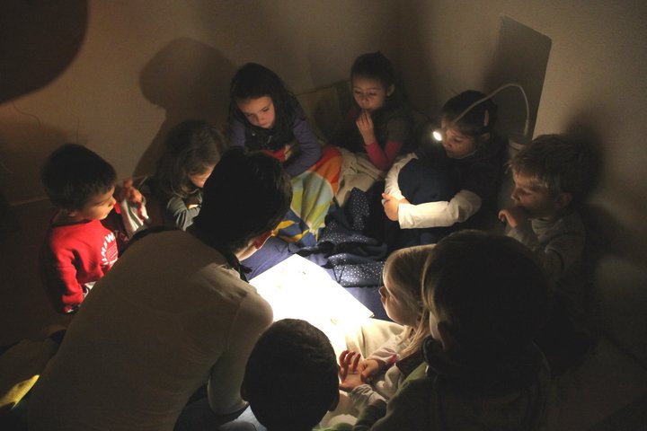Nach dem alle da waren, wurden die kleinen Lese-Anfänger in „vorlesergerechte“ Gruppen zu 10 Kids aufgeteilt. Jede Gruppe ging dann zusammen mit ihrem Vorleser in die dafür eigens liebevoll eingerichteten „Kuschelecken“ mit Decken, Kissen und Lichterketten.